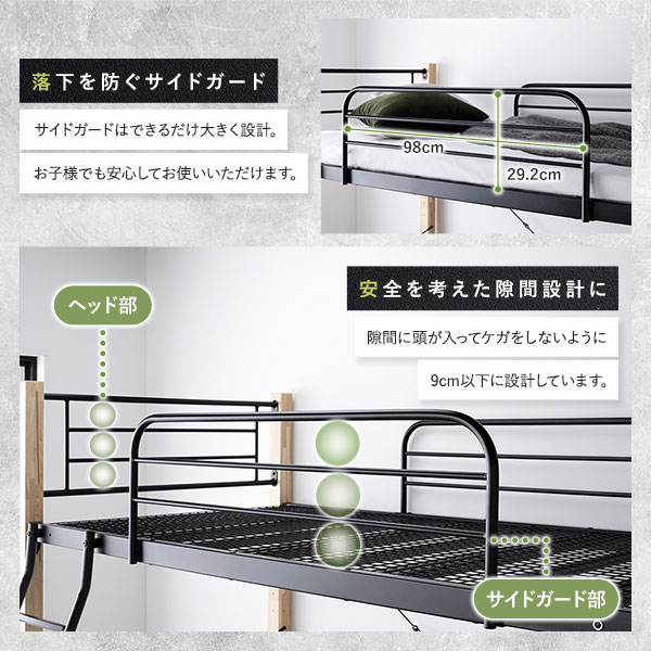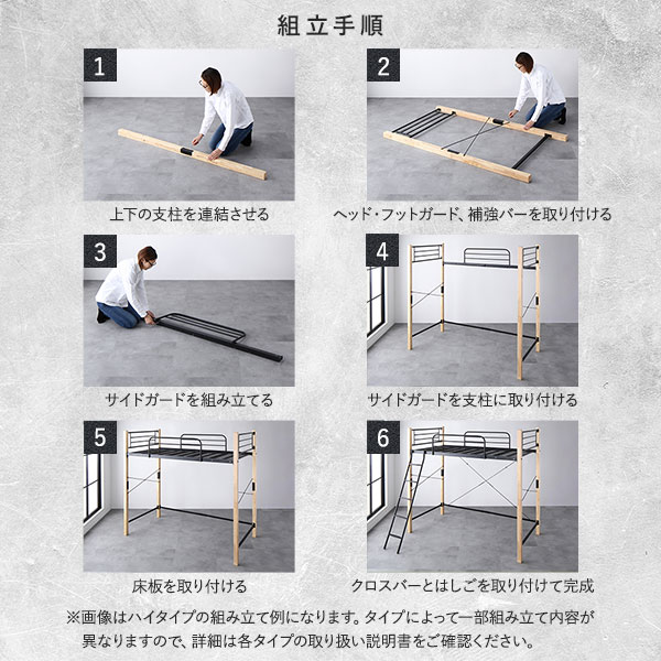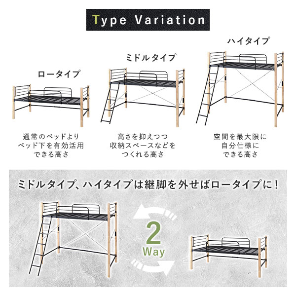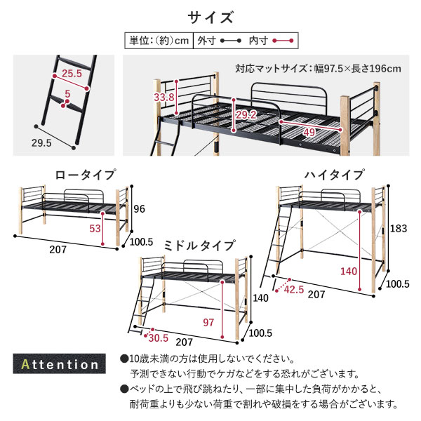 【ベッドフレーム本体】 ■サイズ(全てシングルサイズ) ロータイプ:(約)幅100.5×長さ207×高さ96cm ミドルタイプ:(約)幅100.5×長さ207×高さ140cm ハイタイプ:(約)幅100.5×長さ207×高さ183cm 床面までの高さ:(約)53/97/140cm ■材質 本体:スチール(粉体塗装)、ラバーウッド ■カラー ナチュラル×ブラック、ブラウン×ブラック ■生産国 中国 ■梱包サイズ 梱包数:ロータイプ2梱包、ミドルタイプ・ハイタイプ3梱包 ロータイプ:(約)105×38×17cm、95×40×25cm ミドルタイプ:(約)105×38×17cm、95×40×25cm、106×33×17cm ハイタイプ:(約)105×38×17cm、95×40×25cm、106×3...