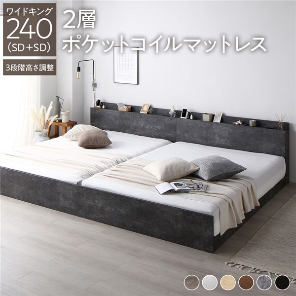 ベッド ワイドキング 240(SD+SD) 2層ポケットコイルマットレス付き ストーングレー 連結 高さ調整可 棚付 コンセント付 すのこ 【北海道・沖縄・離島配送不可】