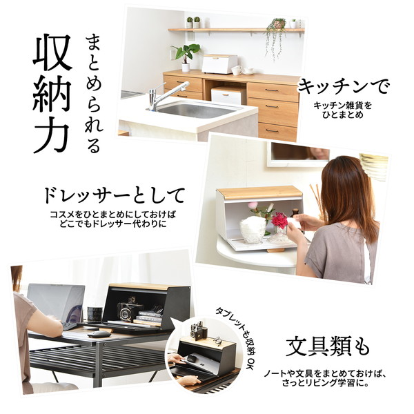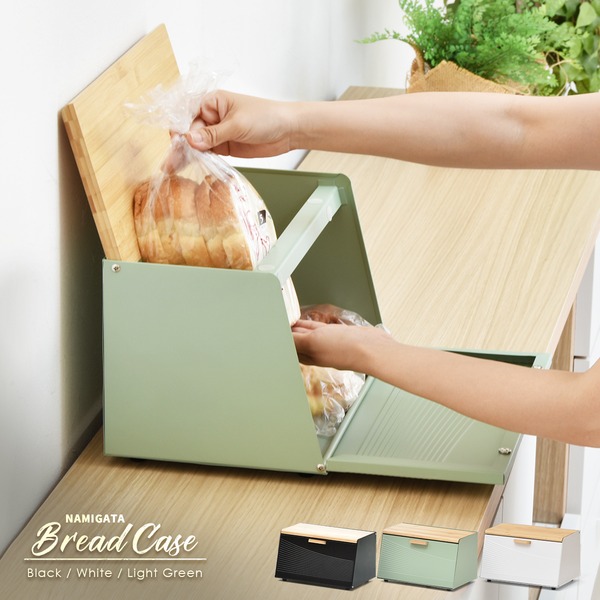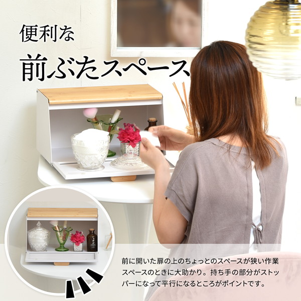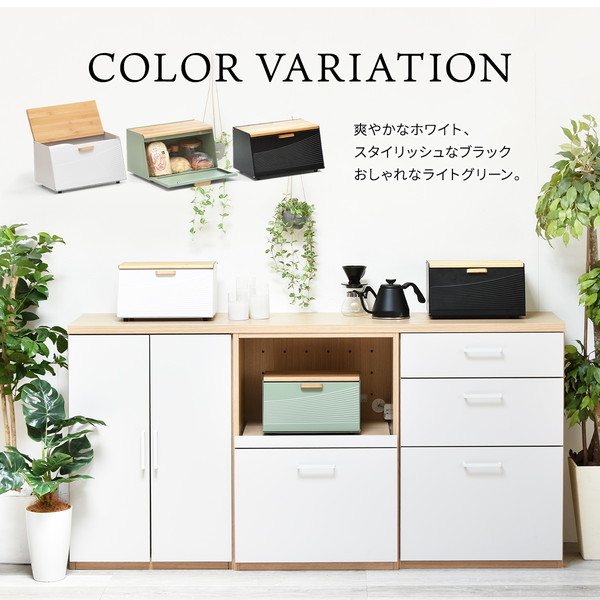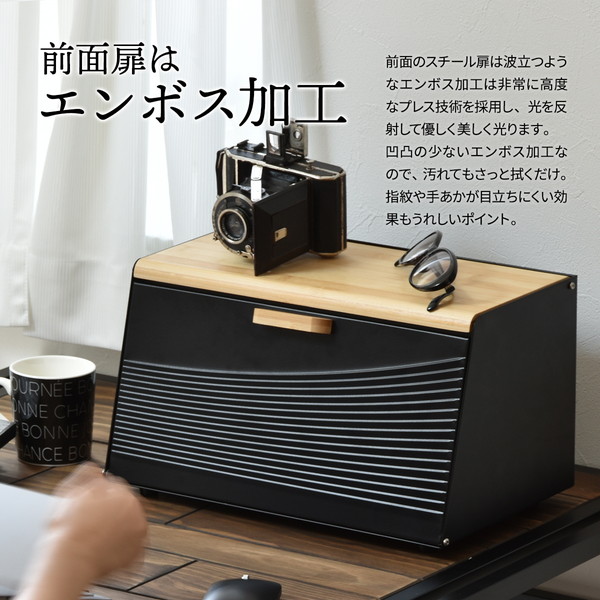 雑然としがちなパンやお菓子、調味料などを収納できるシンプルでスリムなブレッドケース。斜めに設計された前面の扉と天板が大きく開くので出し入れしやすく、生活感のあふれる雑貨をまとめて収納できてキッチンにおしゃれですっきりとした印象を与えます。