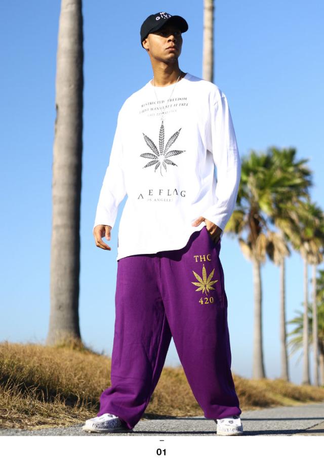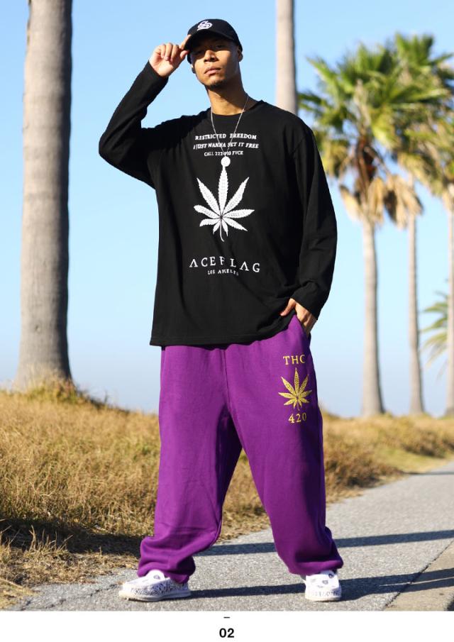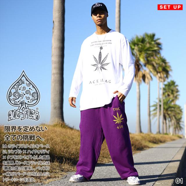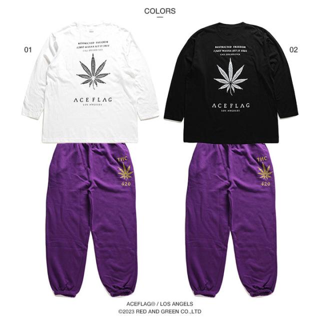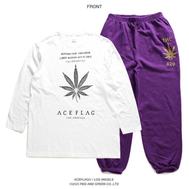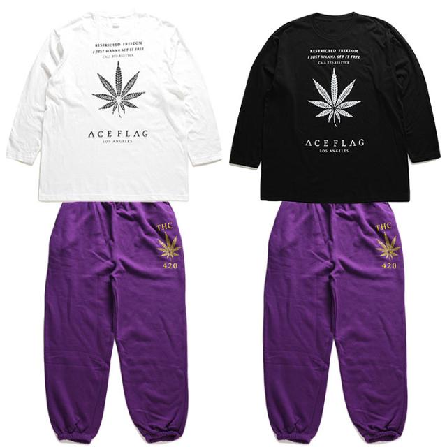 ACEFLAGを代表する「ヘンプ」ロゴと共にTHCや420など、麻の葉に関するワードをドロップしたロンTとスウェットロングパンツの上下セット。