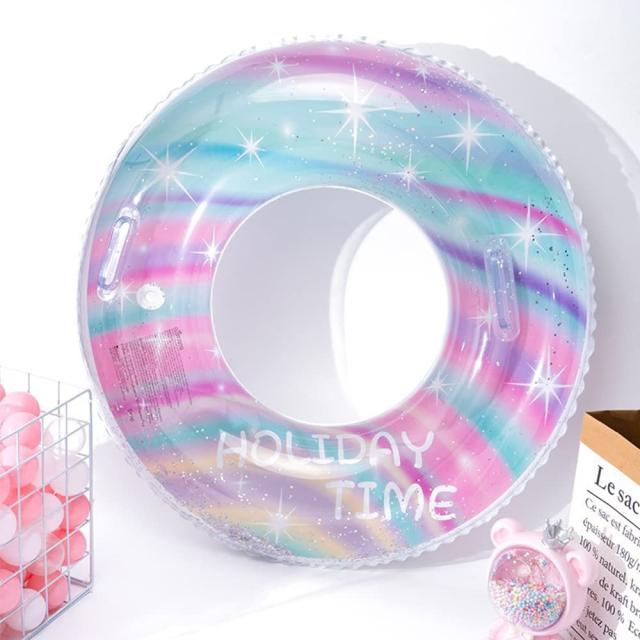 【キラキラきれいな浮き輪】新型の星空O型の浮き輪やキラキラきれいなかけらを入れたデザインのOタイプ浮き輪を登場!夏の海★きれいな浮き輪で写真を撮ってSNSにアップしましょう!!!海でも湖でも存在感バツグン♪♪!<br>【優れた素材】丈夫で破れにくいPVC素材で作られている為、ビーチで引きずっても破れる心配はありませんよ♪耐久性もよく長時間使用しても色褪せません。空気入れと空気抜きが簡単にできるので持ち運びや片付けも簡単でとっても便利!<br>【携帯便利】使わない時は折りたたみしてコンパクトに出来ますので、プールだけ出なく海水浴などでも重宝して使える浮き輪です。 【持ち手付きの浮き輪】安心の取っ手付き、長時間でも安心に使用できます。<br>【適用対象】 90サイズ浮き輪の内径は約33 cm、外径76cmで、70kgまで載れます!15歳以上おすすめです。O型タイプで、穴の部分に身体を入れたり、上から乗ったりして使用します。<br>【夏にぴったり】持ち運びも便利なので、旅行にも持っていくのも◎今年の夏のプール、海水浴、ビーチ、湖などで大活躍間違いなしの浮き輪から楽みをもらおう!夏を満喫しましょう!<br>◆商品名:浮き輪 浮輪 浮き具 大人用 うきわ 水遊び用 フロート キラキラ 持ち手付き ピンク O型 スイミング ビーチ プール 海水浴 水泳 夏休旅行 <br>
