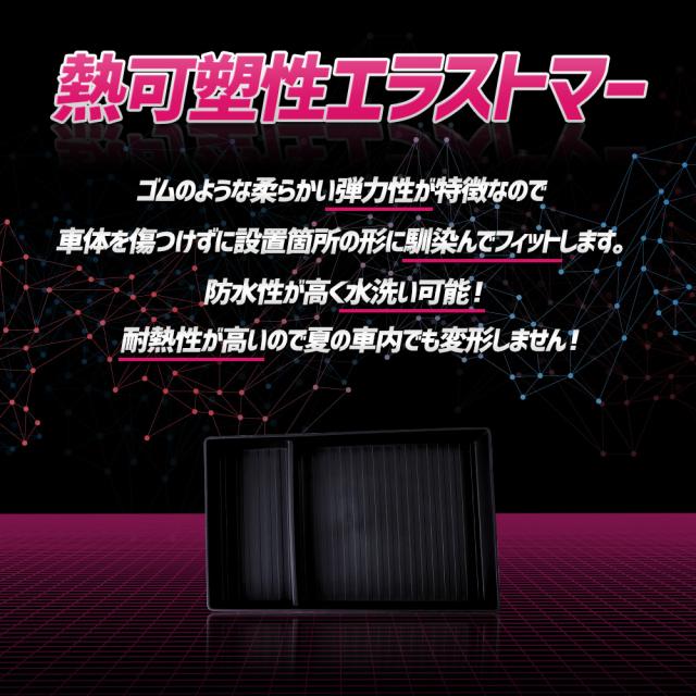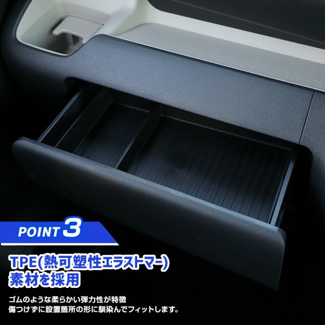 デリカミニのアッパーグローブボックスにピッタリなデザイン設計で、 置くだけでスッキリ整理整頓できるアッパーグローブボックストレーです! デリカミニの純正アッパーグローブボックスは仕切りも無く中身がバラバラ… 鍵や財布、スマホが探しづらい… 充電ケーブルがぐちゃぐちゃ… そこで、スペースに合わせて快適スッキリ収納できる、 デリカミニ専用設計アッパーグローブボックストレー! アッパーグローブボックスにピッタリ収まる専用設計でフィット感は抜群! 走行中にカタカタと音がしないので、ストレスなくご使用いただけます。 整理整頓しやすいパーテーションがあるので収納スペースを使い分けできます。 表面を凹凸形状にして小物が転がりにくいデザインに仕上げました。 防水性が高いTPE(熱可塑性エラストマー)を採用しているので 水洗いが可能! ゴムのような柔らかい弾力性もあるので、車体を傷つけずに設置箇所の形に馴染んでフィットします。 |