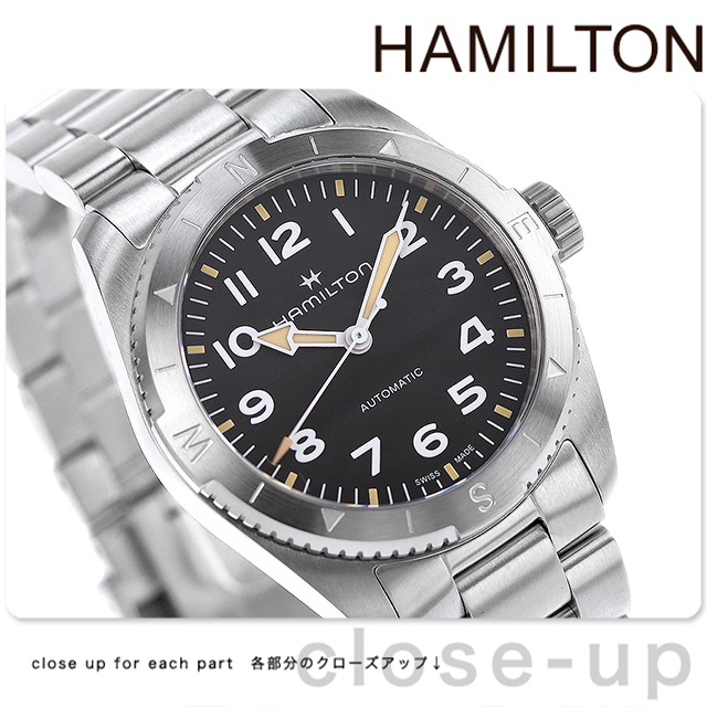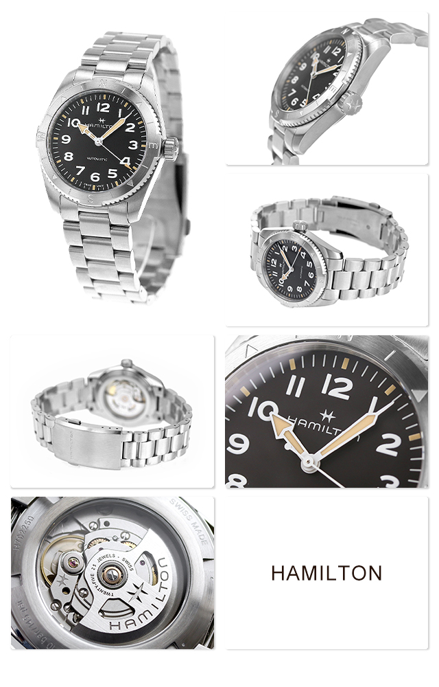 3年保証キャンペーン ハミルトン カーキ フィールド エクスペディション オート 37mm スイス製 メンズ 腕時計 H70225130 HAMILTON KHAKI FIELD EXPEDITION AUTO アナログ ブラック 黒 ◆HAMILTON(ハミルトン)はアメリカ発祥の老舗ブランドです。創業翌年に誕生した懐中時計「ブロードウェイ・リミテッド」は、他の時計よりも正確に時を刻むことから鉄道用時計として採用されました。その後も航空用時計や軍用時計として採用されるなど、品質の高さと流行にながされない独自のデザインが世界中の人々に支持されています。 大自然へと誘う「カーキ フィールド エクスペディション」は、どんな場所にも適応するアドベンチャーウォッチ。質感のあるブラックダイヤルには、視認性に優れるスーパールミノバ加工が施され、いかなる状況下でもタフさを発揮します。 機械式腕時計