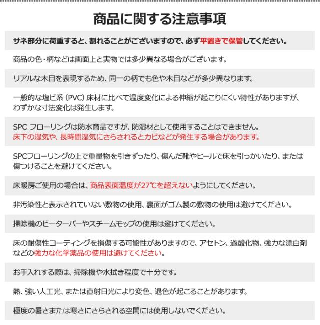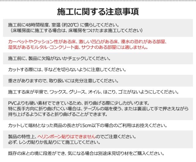 ・カーペットやクッション性がある床、激しい凹凸がある床、浸水の恐れがある部屋、湿気があるモルタル・コンクリート面、サウナのある部屋には適しません。