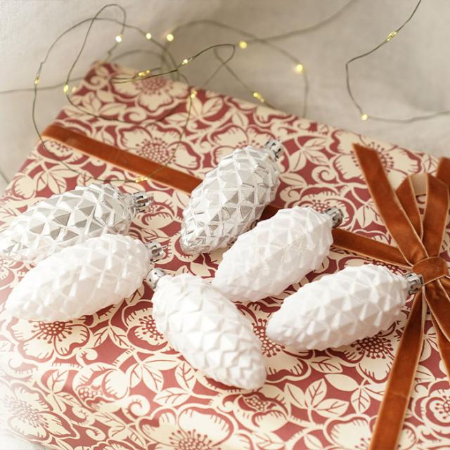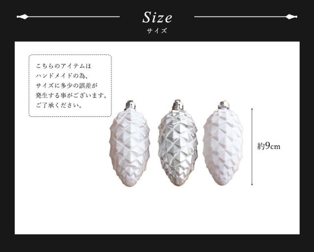 ★パインコーン(松ぼっくり)をモチーフにしたオーナメントです。 美しい冬の季節を表現したシンプルかつ洗練された上品なデザインのオーナメントです。 松ぼっくりに積もった雪が白銀の世界を彷彿とさせる素敵なデザインに仕上がっています。 同系色のオーナメントを複数飾ることで、ツリー全体に統一感と奥行きが出て誰でも簡単におしゃれなツリーに仕上がりますよ。 クリスマスツリーに飾るのはもちろん、天井から吊るしたり、シェルフなどにそのまま置いてディスプレイするのもおすすめです。カフェやお店のディスプレイとしても人気があります。 清楚でおしゃれな雰囲気が好きな方におすすめのオーナメントです。クリスマスツリーを幻想的な雰囲気に仕上げてくれますよ。 サイズは高さが約10cm、6個入りです。 |