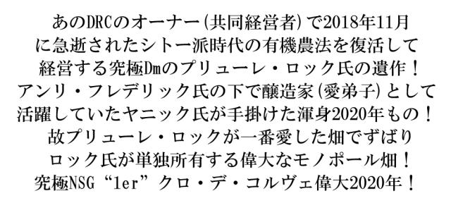 あのDRCのオーナー(共同経営者)で2018年11月に急逝されたシトー派時代の有機農法を復活して経営する究極Dmのプリューレ・ロック氏の遺作!アンリ・フレデリックの下で醸造家(愛弟子)として活躍していたヤニック氏が手掛けた渾身2020年もの!故プリューレ・ロックが一番愛した畑でずばりロック氏が単独所有する偉大なモノポール畑!究極NSG“1er”クロ・デ・コルヴェ偉大2020年!