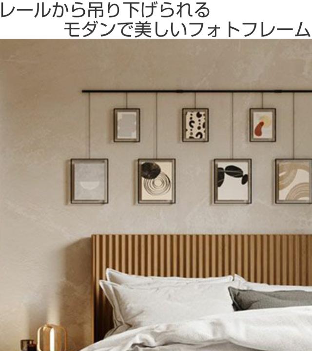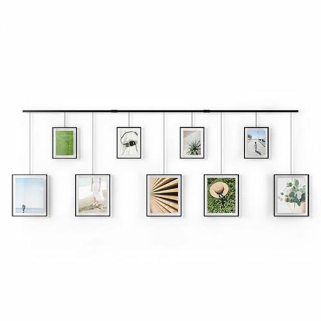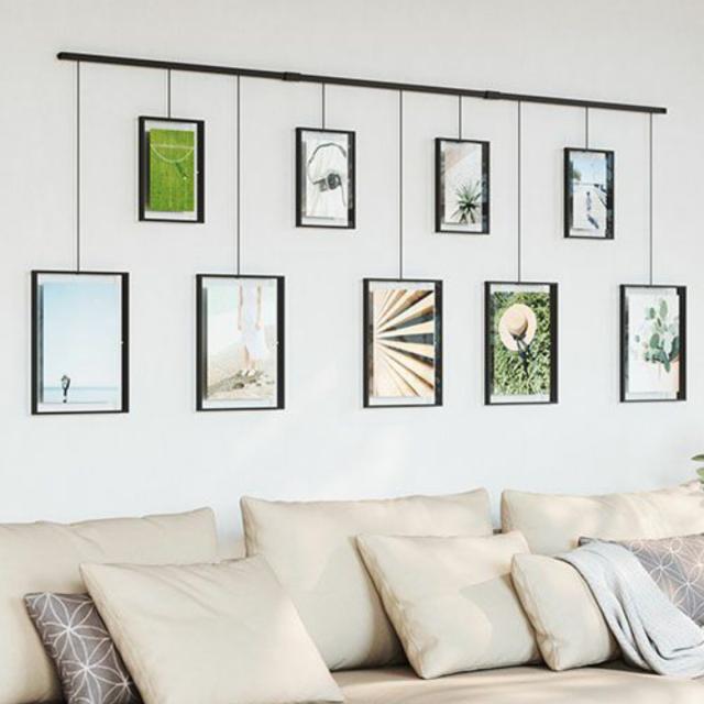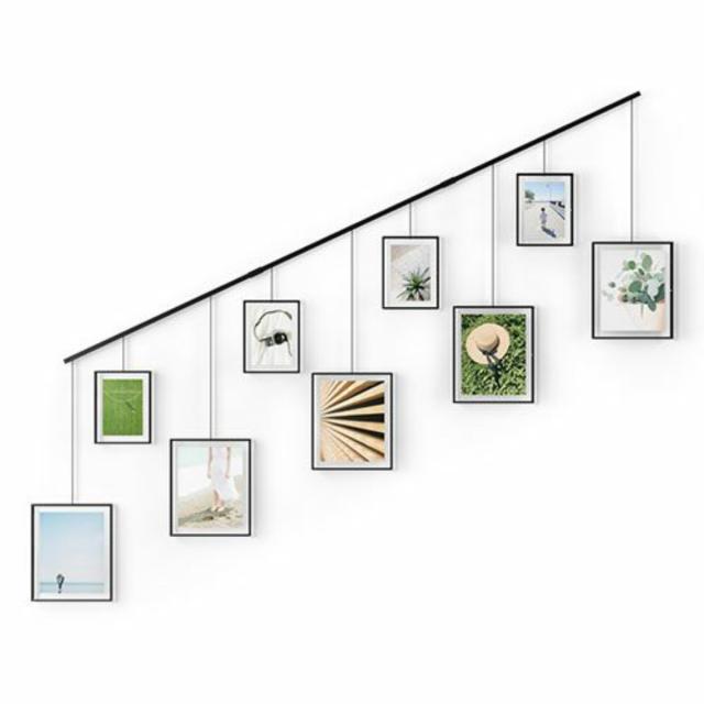 モダンで美しいレールから9個のフォトフレームを吊り下げた、ギャラリースタイルのフォトディスプレイです。お部屋の壁に好みのフォトやイラストを飾って、インテリアをよりおしゃれに演出できます。