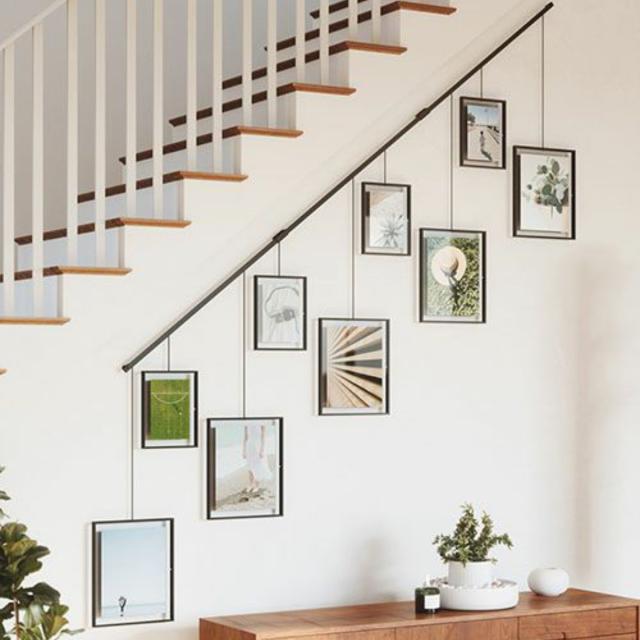 レールは水平に掛けるだけでなく、斜めに掛けることもできるので、階段横の壁にもモダンな雰囲気でディスプレイできます。