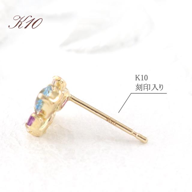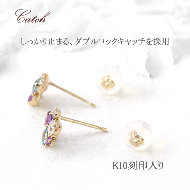 | 地金・素材 | ・ブルートパーズ ・アメジスト ・キュービックジルコニア ・地金:K10YG(10金イエローゴールド) ・ダブルロック キャッチ ※刻印箇所等は画像と異なる場合がございます。 |