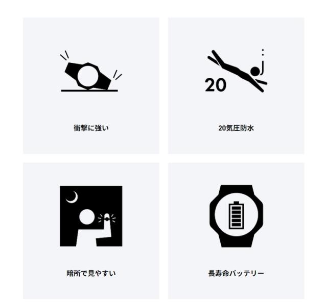 ・ストップウォッチ:1/100秒、24時間計、スプリット付き、時刻モードからのワンプッシュ計測スタート付き、ターゲットタイム報知機能