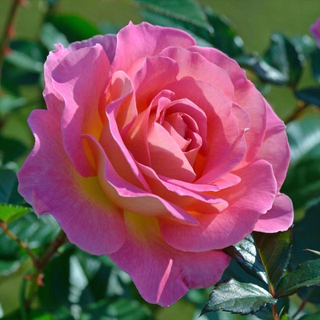 明るいピンクの花弁の裏側に淡い黄色がかる、バイカラー。