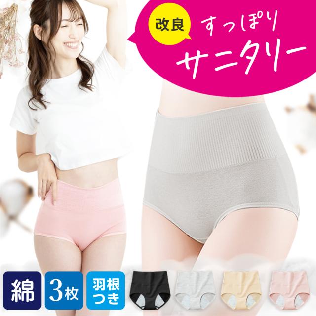 [3枚セット]綿 コットン サニタリー ショーツ ハイウエストショーツ レディースショーツ サニタリーショーツ 羽根つき対応 リブ リブ編みショーツ 温活ショーツ 女性 下着 深め 深履き お尻すっぽり 深ばき 保温 冷えケア リノウル