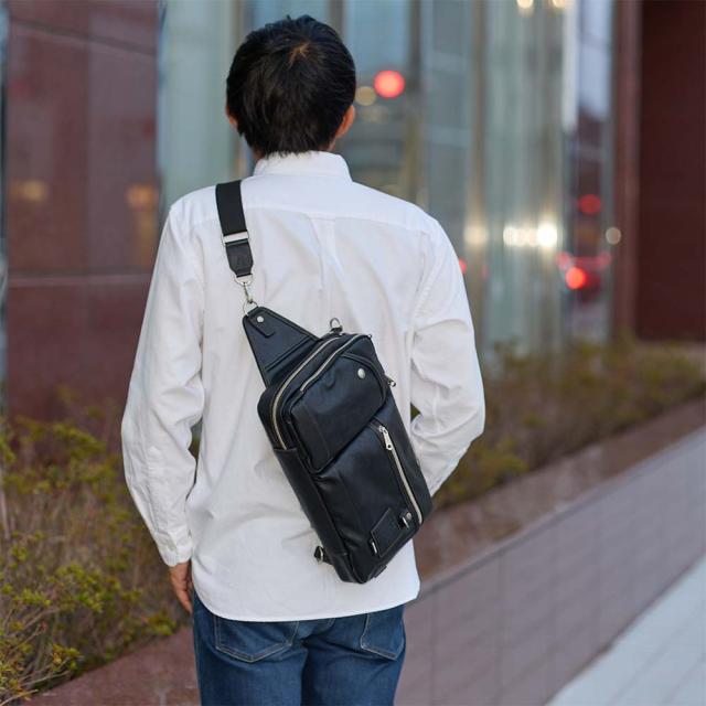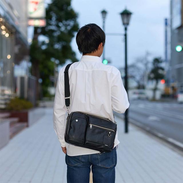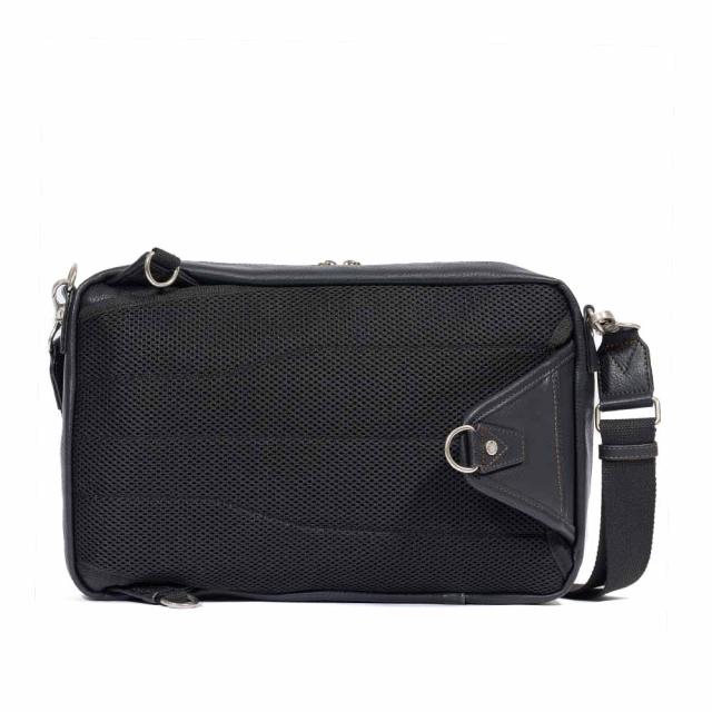 ショルダーバッグとボディバッグの2WAYで使用でき、A4サイズがぴったり収まる大きめのアイテムです。内側の小分けポケットや外側ポケットも備えられているので、小物の収納も不自由なく行えます。外側背面にはメッシュ素材を使用し、ムレを防ぐ設計になっています。