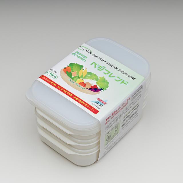 フードロス削減に貢献する環境対策 青果物保存容器 使いきれなかった野菜や果物を長期保存し食品ロスを削減。特許技術によりエチレンガスを分解・排出・防カビ作用で野菜・果物の新鮮さを保持。しかも繰り返し使用可能。【商品名】べジフレンド 青果物 鮮度保持 食品保存容器 【原料樹脂】本体:ポリプロピレン フタ:ポリエチレン 【耐熱温度】本体:120℃ フタ:70℃【耐冷温度】本体:−20℃ フタ:−30℃ 【容量】M:930ml【原産国】日本製