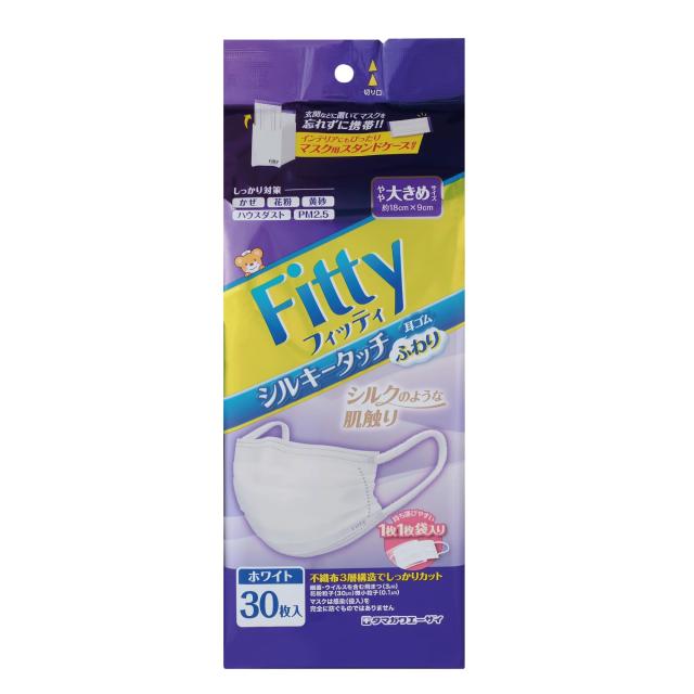 口元側のシルクのような肌触りのなめらか素材により、心地よい着け心地を実現!<br>不織布3層構造でしっかりカット!<br>耳にやさしい幅広ふわふわゴムで耳が痛くなりにくい<br>立体プリーツ加工なので鼻や口を圧迫しません。不快な息苦しさを解消しました。<br>・1枚1枚袋入りで持ち運びに便利!玄関などに置いてマスクを忘れずに携帯できるスタンドケース付き!<br>◆商品名:フィッティ シルキータッチ 耳ゴム ふわり 30枚入 ホワイト やや大きめサイズ<br>●しっかり対策
