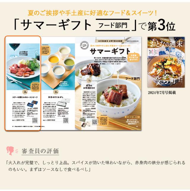 奈良の人気鉄板ステーキ店『シェルブルー』の山口シェフが監修。丁寧に手仕込みし、低温加熱で絶妙に火入れしたローストビーフは、しっとり柔らか。赤身肉の旨みと多種のスパイスが交錯する奥深い味わいで匠の技を実感できる。ソース付きでギフトBOXに。