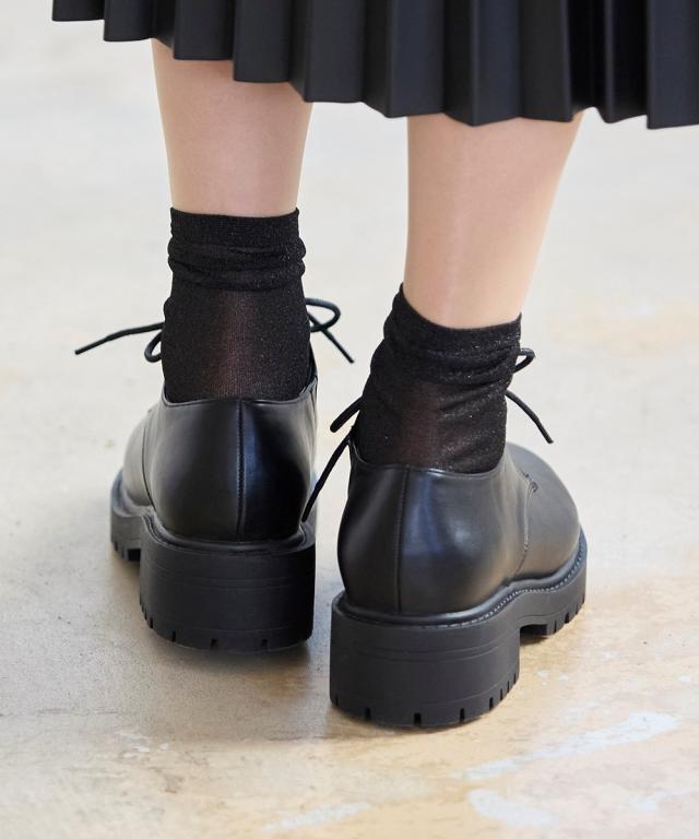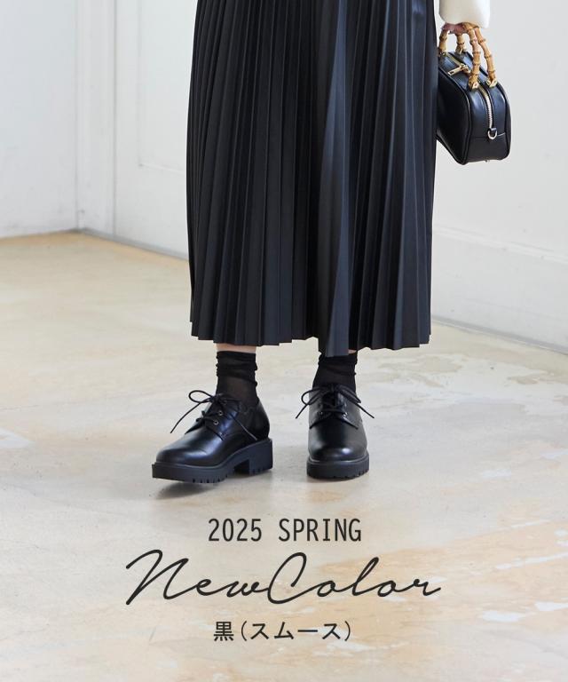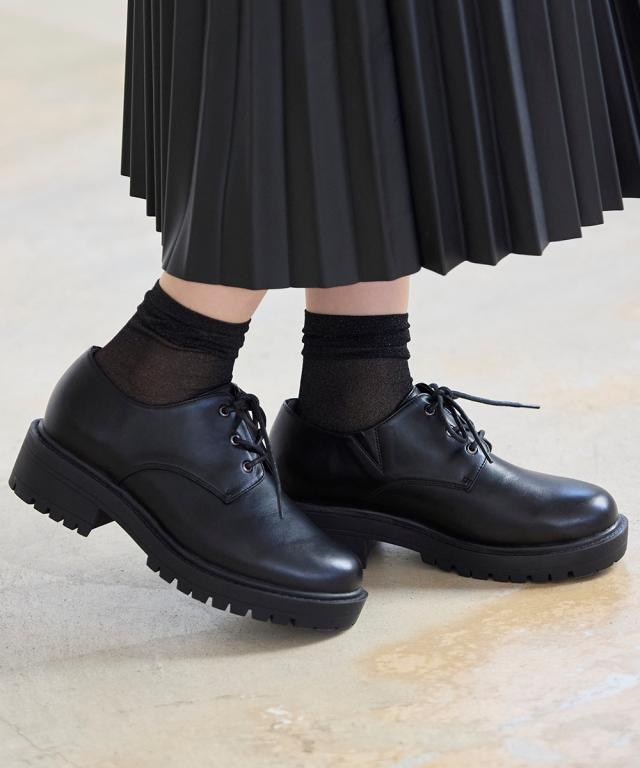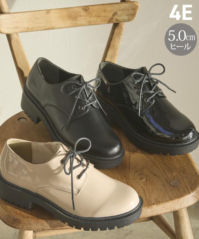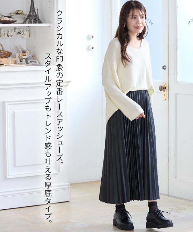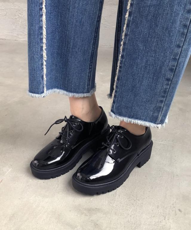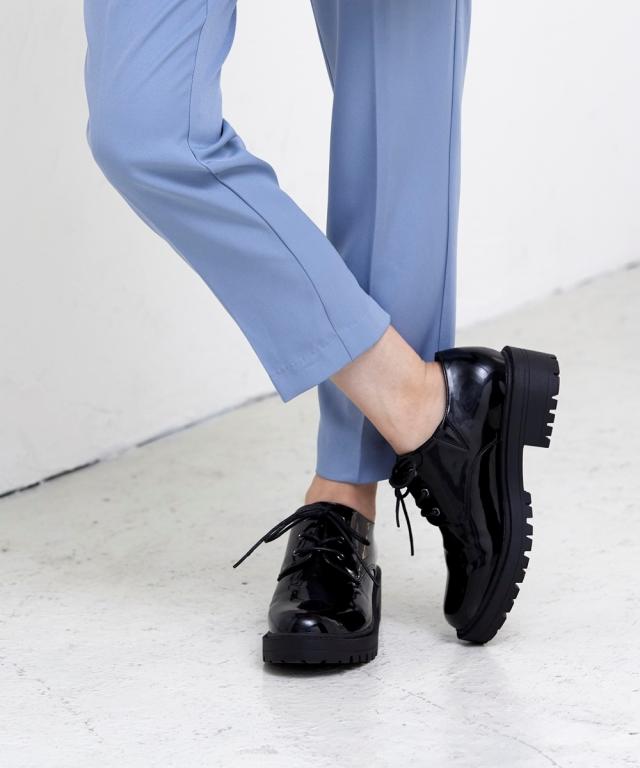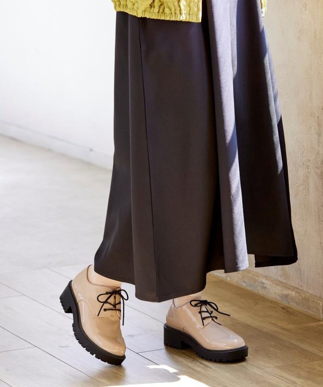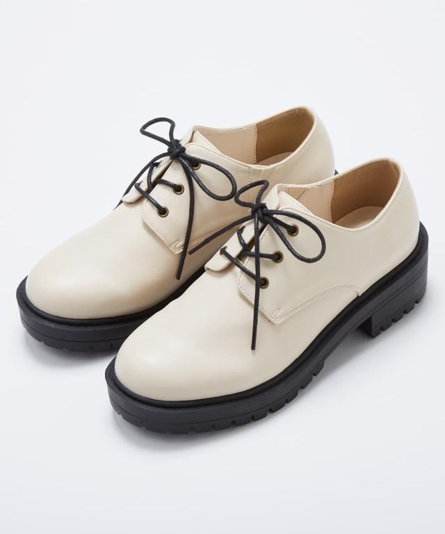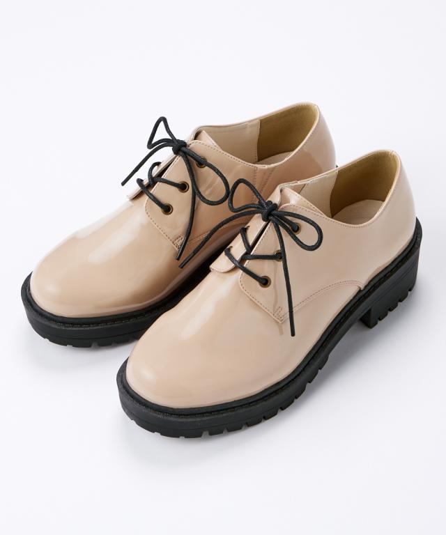 クラシカルな印象の定番レースアップシューズを厚底にすることでトレンド感アップ。 エナメル調の黒、光沢のないスムース素材のライトベージュと、モードっぽくも楽しめる2色展開。ライトベージュは柔らかなカラーながら底色と紐を黒にすることで引き締め効果でスタイリッシュな印象に。 内側はメッシュ素材でで足当たり優しく快適。 しっかり厚みのあるソールはギザギザ仕様で今ドキムードたっぷり。 履き口の内側には隠しゴム入りで脱ぎ履きもスムーズ。