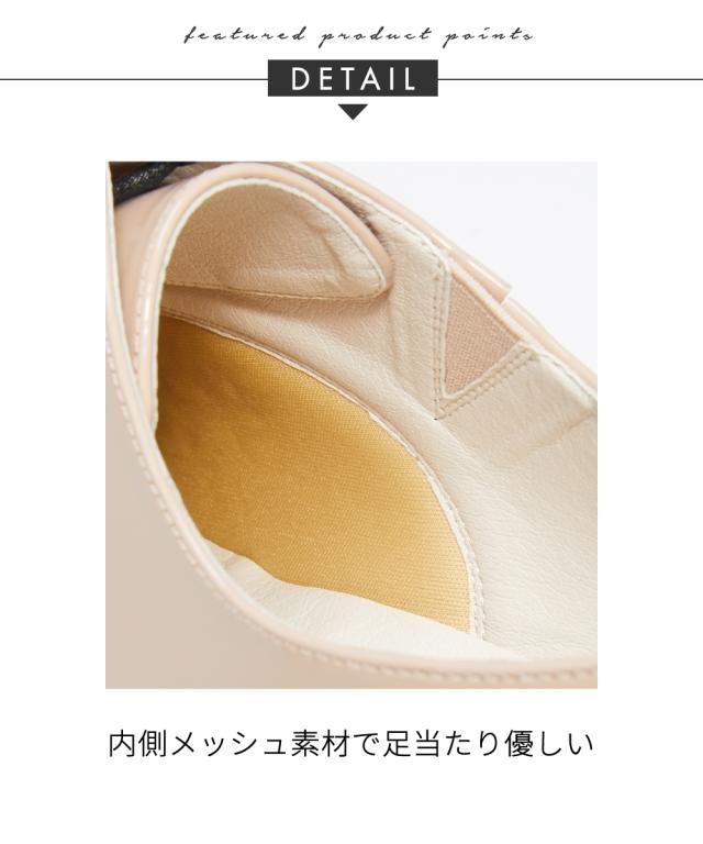 材質=【黒】合成皮革(エナメル調)【ライトベージュ】合成皮革 底材=合成底 底の厚さ(前)=約3cm 底の厚さ(後ろ)=約5cm ワイズ=4E 履き口内側にゴム入り 原産国:中国製
