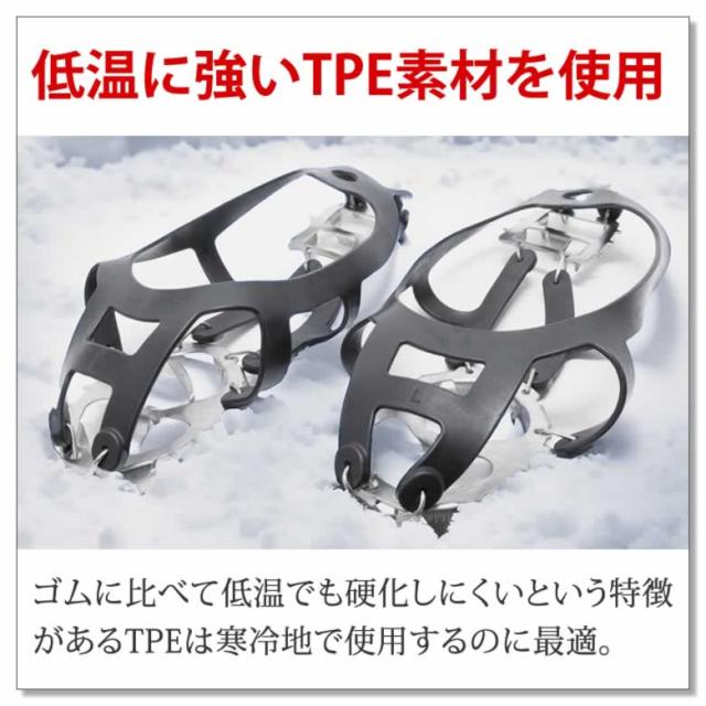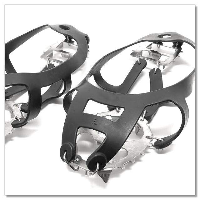 ご使用上の注意 | ・屋内では使用しないでください。 床面の素材によっては床に傷がつく恐れがあります。 ・爪部分は非常に鋭利です。 着脱時や収納時に怪我をしたり衣服や靴などを傷つけないように注意してください。 ・本品は低山用です。 高山や厳冬期など本格的な雪山登山には使用できません。 ・タイルなど、路面の材質や状態によっては、装着時の方が滑りやすくなります。 路面の状態に合わせて適宜着脱してください。 ・氷雪の無い場所で使用すると、爪が折れて破損する恐れがあります。 |