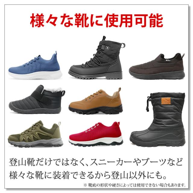 スニーカーやブーツなど様々な靴に簡単に取り付けられる。