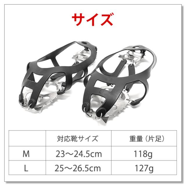 | アウトドアブランドのラドウェザー から、チェーンアイゼン(チェーンスパイク)が登場! 前後左右あらゆる方向に向いた18本の爪で、凍った路面をしっかりキャッチ。 360度全方向に対して滑り止め効果を発揮する。 爪は爪先から踵まで足裏全体に配置されているので、体重を均等に分散できて安定感は抜群、 グラつかきにくい。 爪の長さもしっかりと路面をとらえるが、長すぎない13mm。 滑りにくさと歩きやすさのバランスを考えた時に最適な長さ。 バンド部分には低温でも硬化しにくいTPEを使用。 寒冷地で使う物だがからこそ、素材選びにもこだわった。 装着は靴の上から靴下を履くように被せるだけ。 スニーカーやブーツなど様々な靴に簡単に取り付けられる。 軽量で収納袋も付いているので、持ち運ぶ時も便利。 常にリュックに備えておくと、登山や釣りなどのアウトドアで思いがけない残雪に遭遇しても安心。 付けるだけで、いつもの靴が滑らない靴に変わるから、大雪にも慌てずに済んで安心。 雪道以外にも、ぬかるんだ場所や苔や落ち葉で滑る場所などさま様々な場所で使えるから、冬以外も活躍。 持っていて損はない。 ■18本爪で強力グリップ 前後左右あらゆる方向に向いた18本の爪で、360°全方向に対して滑り止め効果を発揮する。 ■足裏全体の爪で安定感抜群 爪先から踵まで足裏全体に配置された爪で体重を均等に分散できて、グラつかない。 ■13mmの爪で歩きやすい 爪の高さは13mm。しっかりと氷をとらえるが、長すぎないので歩きやすさもキープできる。 ■低温に強いTPE素材を使用 ゴムに比べて低温でも硬化しにくいという特徴があるTPEは寒冷地で使用するのに最適。 ■簡単に装着できる 靴下を履くように靴の上にかぶせるだけ。初めてでも迷わずスピーディーに着脱できる。 ■装着方法 ? 上下、前後を確認します。 爪のある方が下(地面側)、サイズ表記のある方が前(つま先側)です。 ? 靴下を履くように、つま先を入れて引っ張りながらかかとを引っ掛けます。 ■様々な靴に使用可能 登山靴だけではなく、スニーカーやブーツなど様々な靴に装着できるから登山以外にも。 ※ 靴底の形状や硬さによっては使用できない場合もあります。 ■便利な収納袋つき 収納袋付きなので、バッグに入れて持ち歩ける。使用後に鞄に入る時も周りが汚れない。 ■軽量で負担にならない 重量はわずか118g。※ Mサイズ片足の重量 装着中も持ち運ぶ時も重さを感じない。 ■冬の登山や釣りに 軽量なので常にリュックに備えておくと、思いがけない残雪に遭遇しても安心。 ■雪道を歩くときに 付けるだけで、いつもの靴が滑らない靴に早変わり。大雪にも慌てずに済む。 ■足場の悪い場所に ぬかるんだ場所、苔や落ち葉で滑る場所など、雪道以外でも効果を発揮する。 | |