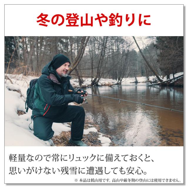 常にリュックに備えておくと、登山や釣りなどのアウトドアで思いがけない残雪に遭遇しても安心。