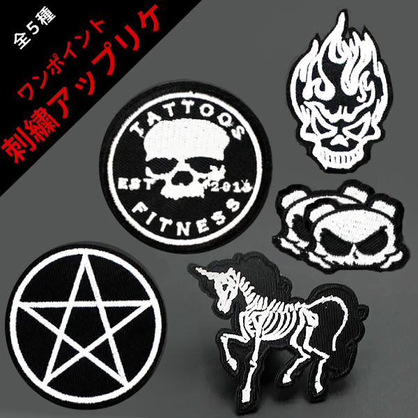 アイロン ワッペン アップリケ スカル 骸骨 ガイコツ ドクロ ワンポイント パンク ロック 五芒星 スター 刺繍 カスタム アレンジ モノクロ 白黒 かっこいい
