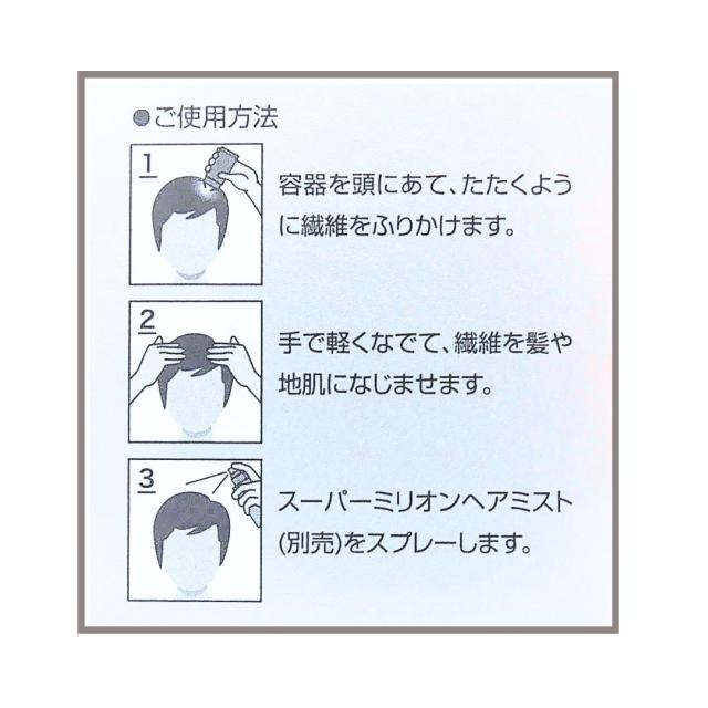 容器を気になる部分に直接あて、地肌が見えなくなる程度まで軽くたたくようにふりかけます。(髪に付着したスーパーミリオンヘアーがとれてしまうため、クシやブラシは使用しないで下さい。)