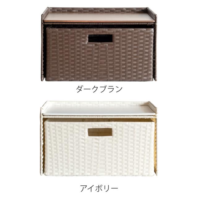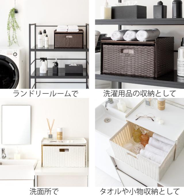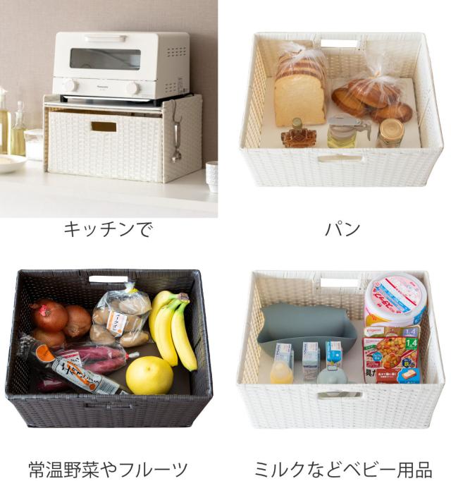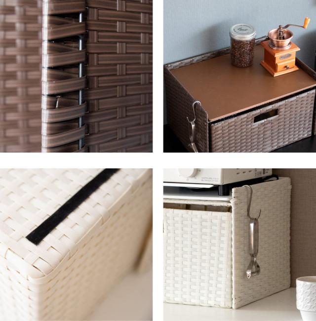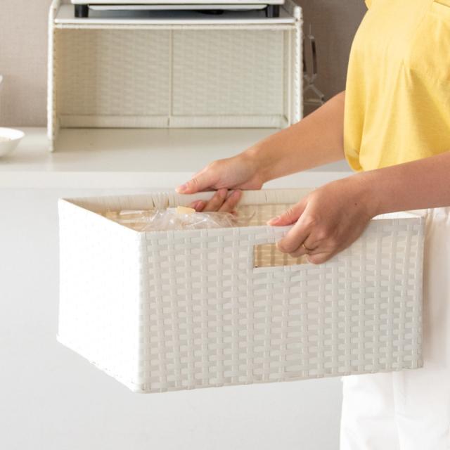 丁寧に手編みされた樹脂製ラタンは軽くて丈夫なポリエチレン製です。水や傷に強いので水周りにも最適です。また通気性が良く湿気がこもりにくいので食料品の保管にも安心です。