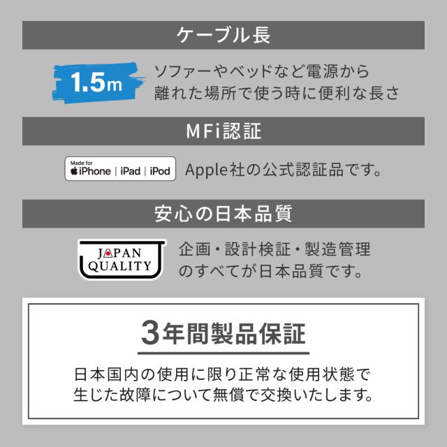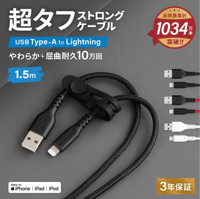 Type-A to Lightningケーブル 1.5m やわらか超タフで断線に強い 耐屈曲10万回以上 急速充電2.4A/データ転送