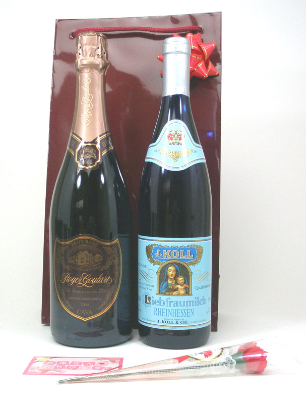 あの噂の万円のドンペリに勝ったワイン”ロジャ-グラ-トカヴァロゼ(スペイン)%mlスパークリングワイン”と高品質ドイツワイン”リ-プフラウミルヒ(ドイツ)白mlml”セットお母さんありがとう母の日カード、お母さんありがとうカ-ネイション付