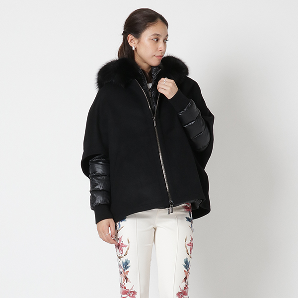 ケープとダウンジャケットを組み合わせており、セットでの着用はもちろんそれぞれ単体でも活躍してくれます。落ち着いた色合いながら、フードのふわふわとした風合いが華やかさを演出。どちらも上下から開閉できるダブルファスナータイプです。