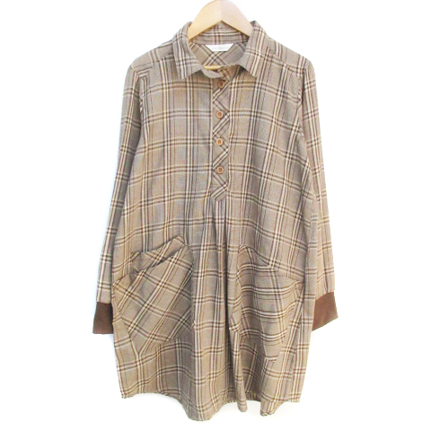 【中古】Varutessa シャツワンピース ひざ丈 長袖 スキッパーカラー グレンチェック柄 M 茶 ベージュ レディース