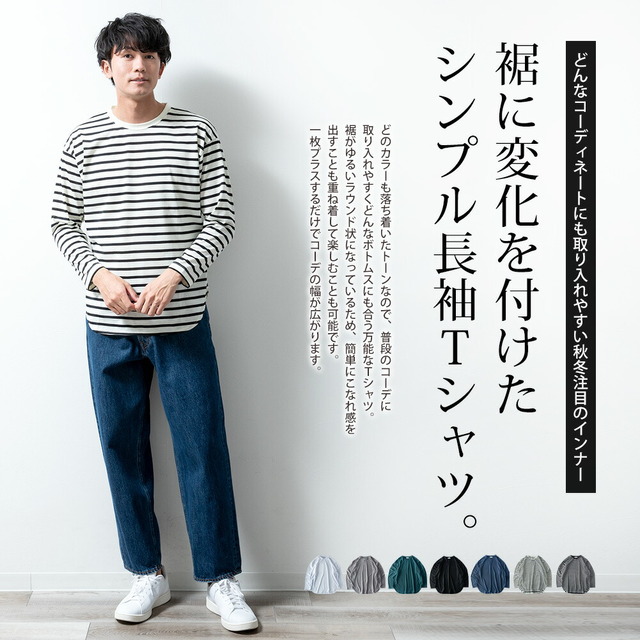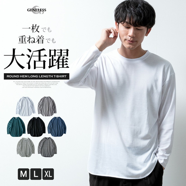 tシャツ メンズ 長袖 ラウンド裾 クルーネック 長袖tシャツ 重ね着 クルーネック インナー 秋冬 トップス 無地 シンプル ボーダー 全7色 2478-2490 ジェネレス