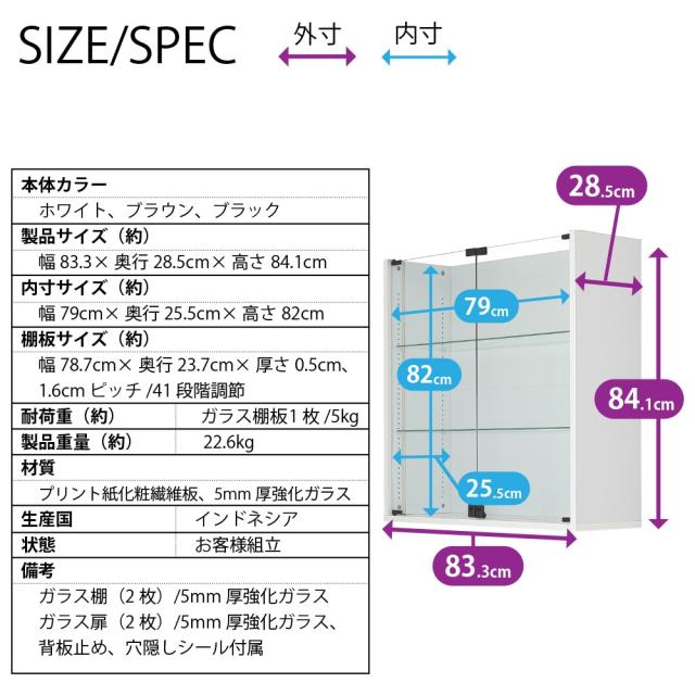 備考 | ガラス棚板(2枚)/5mm厚強化ガラス、ガラス扉(2枚)/5mm厚強化ガラス、背板止め、穴隠しシール付属 |