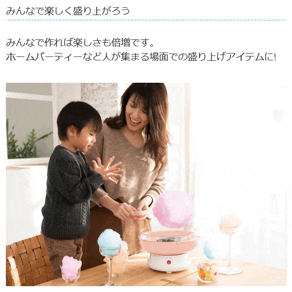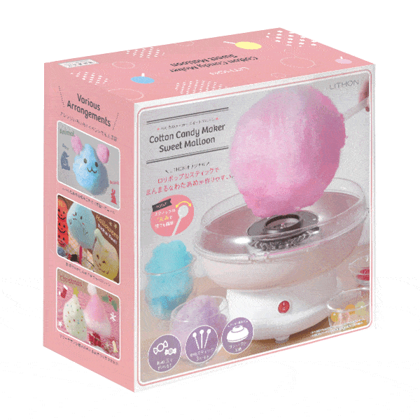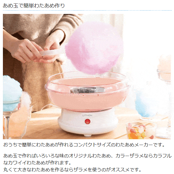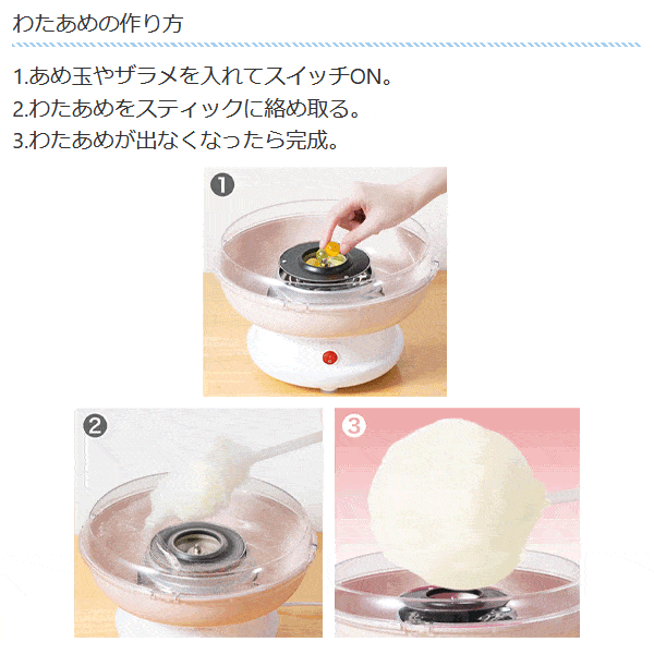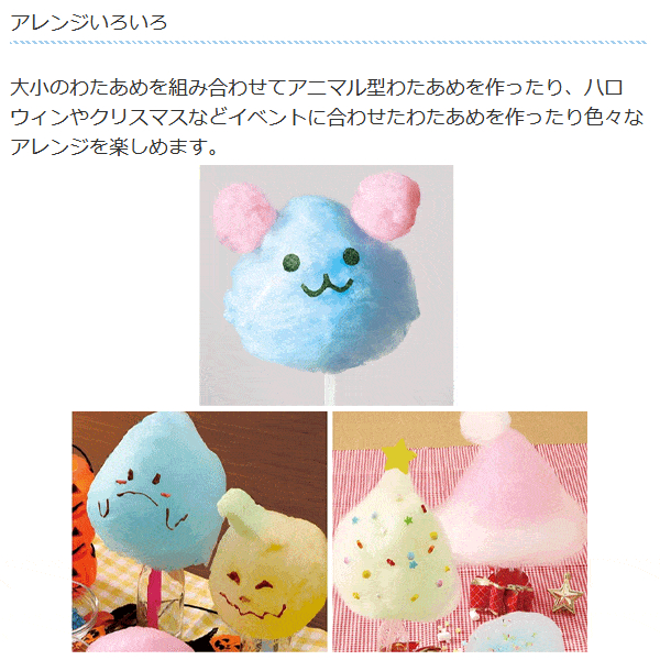 | ロリポップ型スティックで まんまるわたあめが作りやすい! あめ玉やザラメで作れる わたあめメーカー。 | |