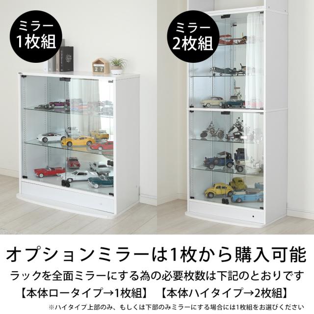 オプションミラーは1枚から購入可能。ラックを全面ミラーにする為の必要枚数は【本体ロータイプ→1枚組】【本体ハイタイプ→2枚組】です。※ハイタイプ上部のみ、もしくは下部のみミラーにする場合には1枚組をお選びください