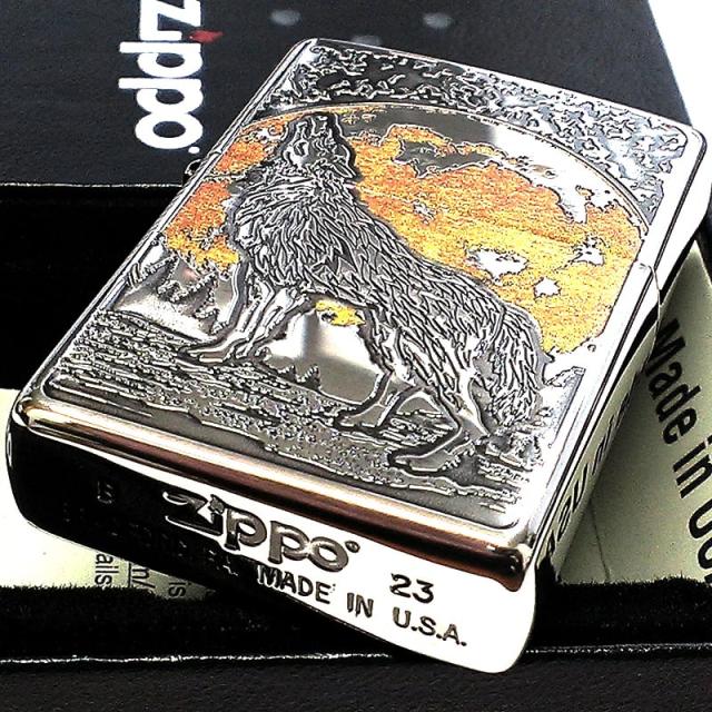 燻し仕上げの本体に、大陸で遠吠えをするオオカミがデザインされた迫力のあるジッポライターです。
