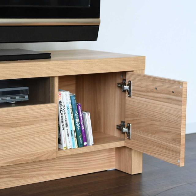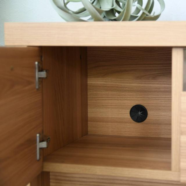 テレビ台の両端は扉収納で本やDVD、小物を収納できます。コードを通す穴が各扉収納に開いているので、ルーターやゲーム機の充電器をコンセントに繋げたまま収納することができます。取っ手は細身のブラックカラーで持ちやすく、さりげないアクセントになっています。