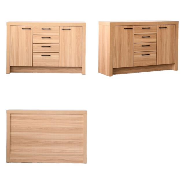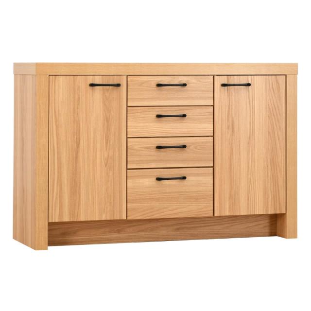 扉収納2つに4段の引出しがあるサイドボードです。収納力が高く、お部屋をすっきり片付けることができます。表面はオーク柄で立体感のあるシートを使用しており、天然木のような風合いを再現しています。シンプルなデザインで、お部屋に馴染みやすいです。