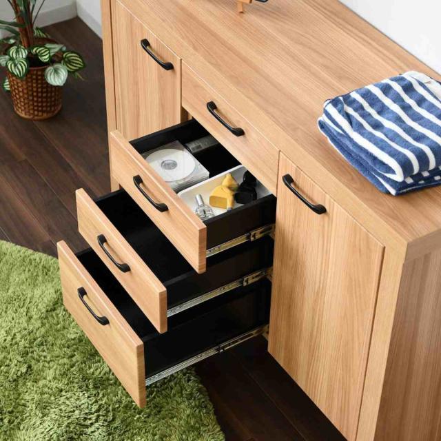 中央は深さの違う引出しが4段あり、収納するものに合わせて使い分けできます。また、引出しにはスライドレールが使用されており、スムーズに引き出すことができます。