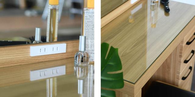 正面は大きな1枚鏡でメイクしやすいです。2口コンセントもあるのでヘアアイロンやコテもお使いいただけます。天板はガラス製で汚れてもさっと拭き取ることができます。