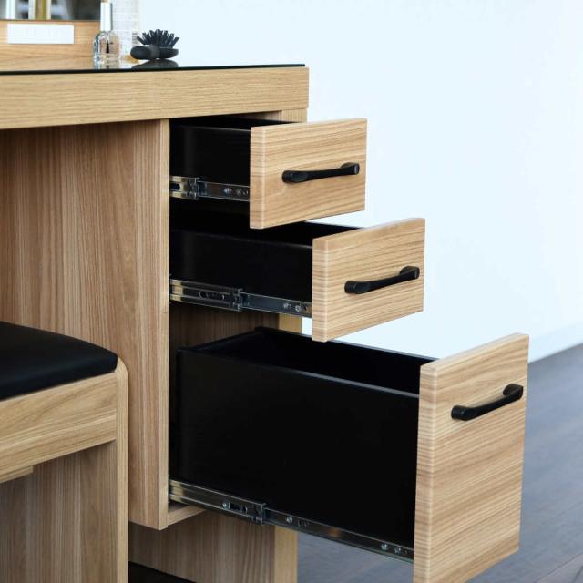 右側にはサイズの違う引出しが3段あります。一番下の引出しは深さがあるので化粧品のボトルなども入れることができます。引き出しにはスライドレールが使用されており、スムーズに引き出すことができます。取っ手は細身のブラックカラーで、さりげないアクセントになっています。