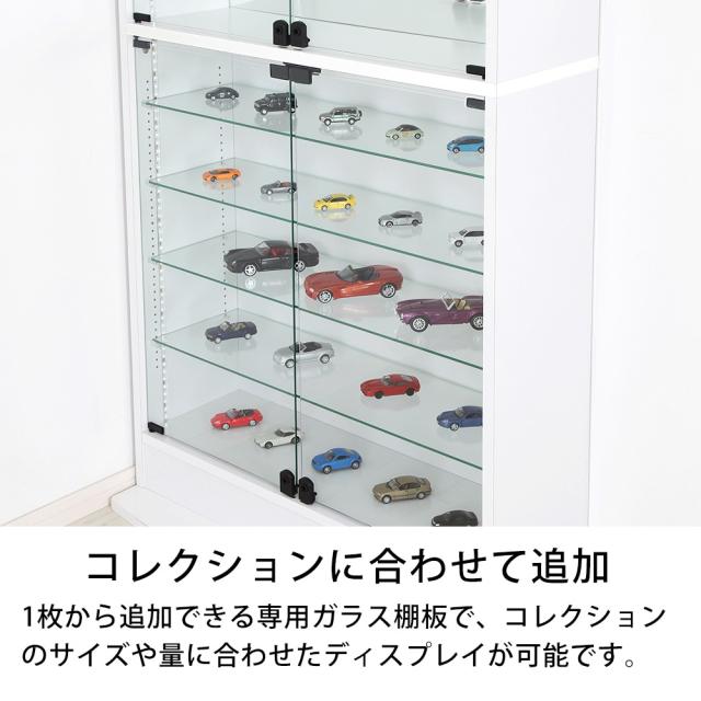 1枚から追加できる専用ガラス棚板で、コレクションのサイズや量に合わせてディスプレイが可能です。