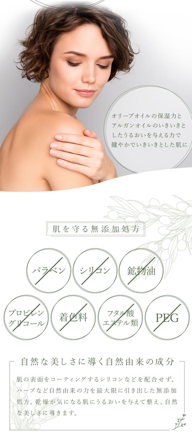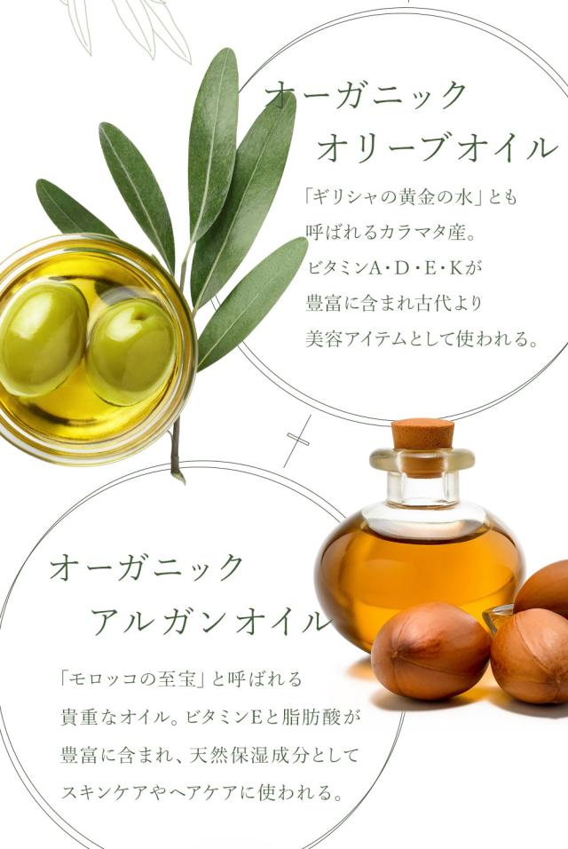 オーガニックのオリーブオイルとアルガンオイルを配合。オリーブオイルの保湿力とアルガンオイルのうるおいを与える力でしっとりとした肌へ。