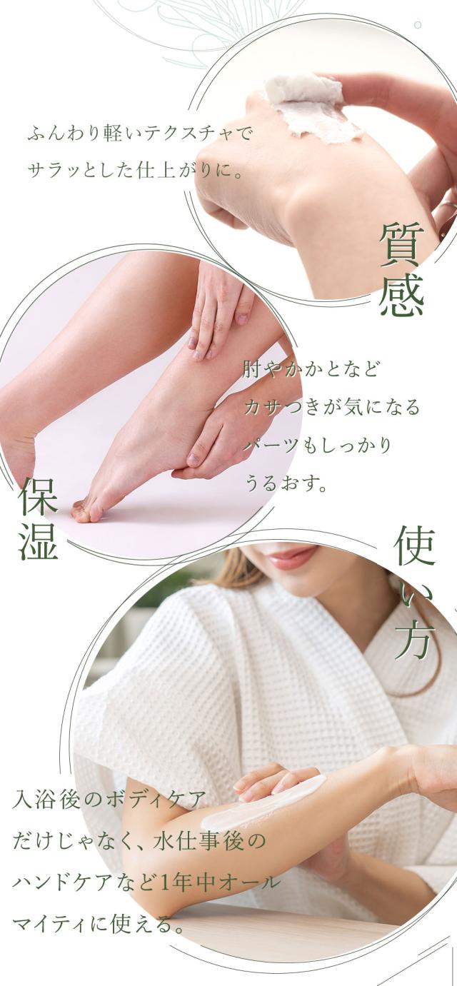 | 商品説明 | ヴィーガンにインスパイアされた肌にしっかりとうるおいを与えて整えるボディークリーム。ふんわり軽いテクスチャーで、心地よい香りが身体を包み込みます。 |
