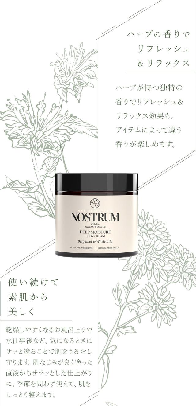地中海産の原料を使用し、自然由来成分をたっぷり配合。ベルガモットとホワイトリリーが肌にうるおいを与えて整えます。