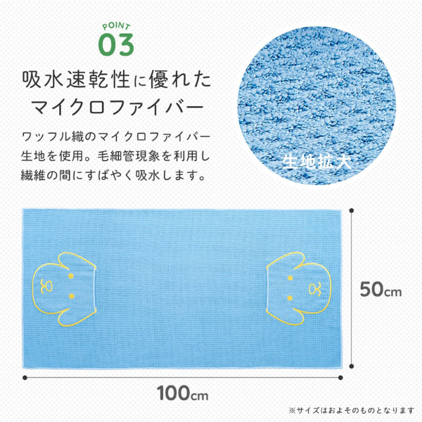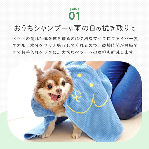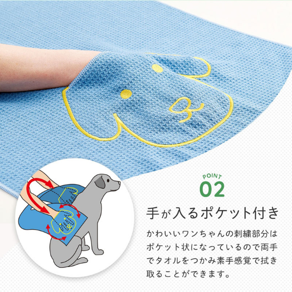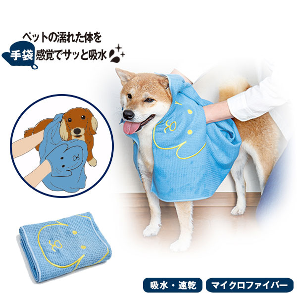 ペットの濡れた体を素手感覚でサッと吸水!ペットのおうちシャンプーや雨の日の拭き取りに便利です。吸水速乾性のあるワッフル織のマイクロファイバー生地だから、乾燥時間の短縮でペットも人もラクラク!手が入るポケット付。【サイズ】約50×100cm【材質】ポリエステル85%、ナイロン15%