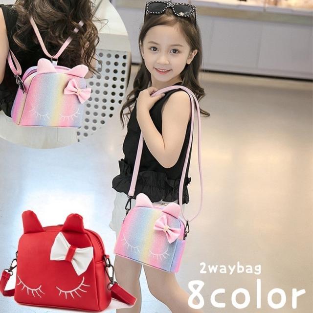 2wayバッグ ショルダーバッグ リュックサック 子供 キッズ 鞄 カバン 肩掛け 斜め掛け 女の子 ポシェット ネコ型 リボン