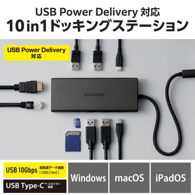 エレコム ドッキングステーション 10in1 USB PD対応 Type-Cx2 USB-Ax4 HDMIx1 LANx1 SD┃DST-W03